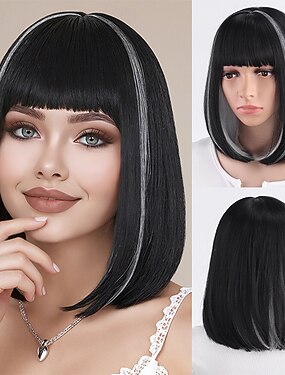 Perucas sintéticas Kinky Liso Onda de Água Corte Assimétrico Franja Lisa Fabrico à Máquina Peruca 14 polegadas A1 Cabelo Sintético Mulheres Clássico Confortável Cores Gradiente Preta