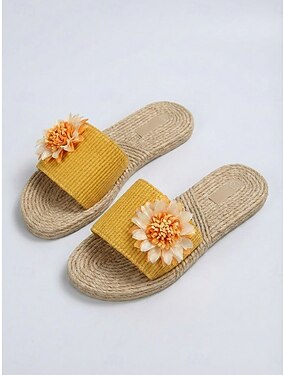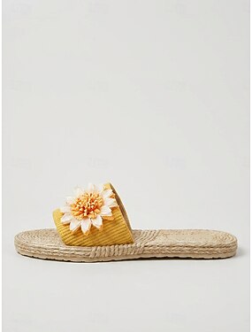 Sandálias femininas amarelas de corda trançada com estampa floral - sandálias rasteiras confortáveis para praia com detalhe de girassol, perfeitas para férias de verão e viagens para ilhas