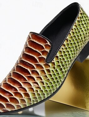 Mocassins masculinos de couro verde e marrom com estampa de cobra, modelo slip-on, ideais para baladas, festas e para quem busca um visual ousado.
