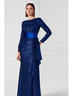 Linha A Tubinho Longo Vestidos de baile Vestidos de noite Vestido de Baile Vestido formal Elegante Brilhante Manga Longa Gola Redonda Casamento Formal Capas Paetês com Purpurina Fru-Fru