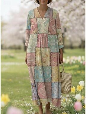 Mulheres Vestido midi Vestido casual Vestido de turno Vintage africano Diário Ao ar livre Férias Normal Floral Bloco de cor Manga Longa Decote V Rosa Verão Primavera Outono