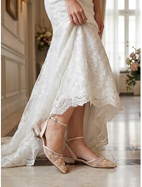 Sapatos de noiva de salto alto com bico fino em renda pérola cor damasco, elegantes sapatos de casamento estilo stiletto para noivas urbanas.