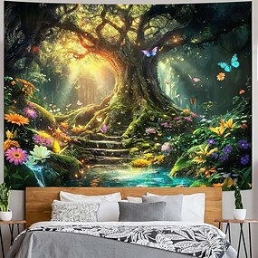Tapeçaria de parede com árvore da vida em uma floresta mágica encantada, com borboletas, flores, caminho de pedra, luz solar e cachoeira. Arte fantástica para decoração de quarto e sala de estar.
