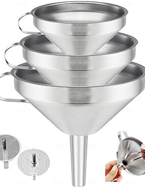 Conjunto de 5 funis de aço inoxidável com 3 unidades e 2 filtros removíveis para uso na cozinha. Funil de qualidade alimentar para cozinhar, conjunto de funis de metal para encher garrafas e