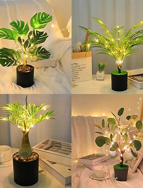 Luminária noturna LED realista em vaso com plantas, alimentada por USB, com folhas de palmeira, monstera e eucalipto – iluminação decorativa para interiores, ideal para quarto, sala de estar,
