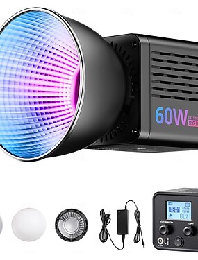 Luz de vídeo COB RGB C60RGB de 60W, mini luz LED portátil Bowens para fotografia, iluminação contínua de 2500K a 6500K, CRI ≥ 95, 20 efeitos, bateria recarregável de 3300mAh, com rosca de 1/4",