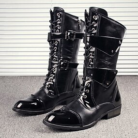 Botas masculinas pretas punk rock de cano alto – couro envernizado brilhante com tiras de fivelas múltiplas e cadarço frontal para trajes góticos, de motociclista, de show e de Halloween