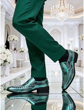 Mocassins masculinos em verniz verde metálico com padrão de crocodilo e pedras azuis - calçado formal elegante para ocasiões especiais e casamentos.