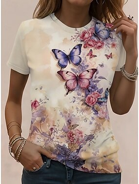 Mulheres Camiseta Imprimir Âmbar Floral Gráfico Vintage à moda Clássico Manga Curta Decote V Tops regulares Diário Final de semana Azul Amarelo Verde Arco-íris Verão Primavera