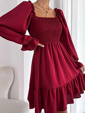 Mulheres Minivestido vestidos peplum Vestido franzido Moderno Ao ar livre Feriado Para Noite Normal Tecido Manga Longa Decote Quadrado Preto Vinho Verde Tropa Castanho Claro Primavera Outono