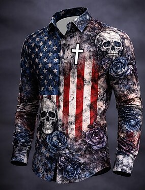 Homens Caveiras 4 de julho - 250º aniversário dos EUA Bandeira dos EUA Camisa Social camisa de botão Manga Longa Vintage retrô Feriado Casual / Diário Primavera Outono Aberto para a Lateral Impressão