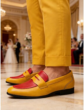 Mocassins masculinos vermelhos e amarelos, com design arrojado, ideais para convidados e padrinhos de casamento, calçado formal elegante e confortável.