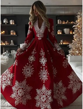 Vestido Maxi de Floco de Neve para Mulheres - Natal - Vestido Pregueado - Casual de Festa - Boho - Uso Diário - Saindo - Ajuste Regular - Gráfico - Manga Longa - Gola em V - Vinho - Verde - Outono