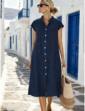 Vestido midi feminino, vestido camisa, vestido de verão, vestido casual boho, vestido para férias, vestido para o dia a dia, vestido solto, liso, manga curta, lapela, azul, cinza, rosa, preto, amarelo, verão, primavera