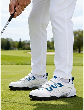 Sapatos de golfe masculinos, em couro sintético branco com listras azuis, respiráveis e leves, com sola antiderrapante, perfeitos para campos de golfe, esportes ao ar livre e um estilo de vida ativo.
