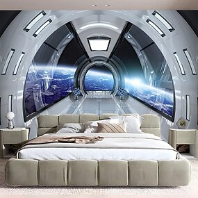 Mural de parede 3D com interior de nave espacial, arte de parede de ficção científica com vista da Terra a partir do espaço, tapeçaria futurista para decoração de quarto e sala de jogos.