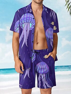 Homens Água-Viva 2pcs Conjuntos de camisas Camisa havaiana Manga Curta Calças curtas Aberto para a Lateral Havaiana Casual Casual férias na praia Impressão 3D Verão Violeta