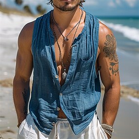 Homens Malha Íntima Top de colete Camiseta Interior camisa sem manga Sem Manga Sem Colarinho Verão Tecido Moda Designer Básico Botões Férias Rua Para Noite Azul Top Tee para Homens