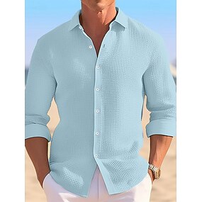Homens Camisa Social Camisa Waffle camisa de verão Camisa casual camisa de botão Camisas para fora da calça Preto Branco Caqui Azul Claro Manga Longa Tecido Lapela Férias Diário Roupa Algodão Moda