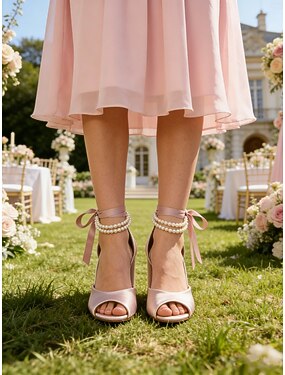 Sandálias rosa blush com salto bloco para madrinhas – sapatos de salto alto de cetim com bico aberto, tira no tornozelo com pérolas e laço, ideais para casamentos, cerimônias, recepções, formaturas e eventos formais.