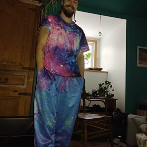 Le t-shirt galaxy est incroyable et doux. Il sagence avec le tempérament de mon copain et les pantalons galaxie sont de la bonne taille,. Les poches du pantalon sont assez spacieuse et confortable. Il adore son outfit. Prix abordable