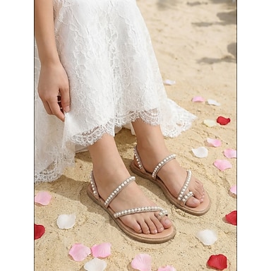 Sandálias rasteiras femininas com aplicações de pérolas - calçado confortável e elegante para casamentos na praia.