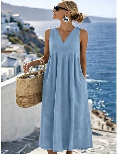 Mulheres Vestido Longo Linho de algodão sintético Vestido A Line Casual Diário Ajuste Largo Tecido Sem Manga Decote V Azul Verão Primavera