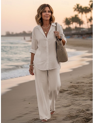 Mulheres Conjuntos de calças Bolero Linho de algodão sintético Manga 3/4 Colarinho de Camisa Tecido Moda Roupa de rua Diário Casual Diário Ao ar livre Branco Marron Verde Verão Ajuste Largo