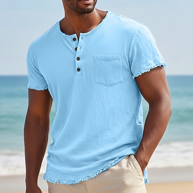 Homens T-shirt Camiseta de linho Manga Curta Tecido Moda Designer Básico Macia Henley Casual Praia Férias Verão Rosa Branco Azul Claro Camiseta Henley