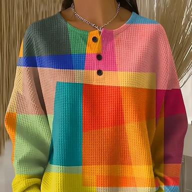 Mulheres Camiseta Imprimir Gráfico Geométrica Abstrato Vintage à moda Moderno Manga Longa Pescoço Entalhado Tops regulares Diário Final de semana Azul Rosa Vinho Vermelho Laranja Primavera Outono