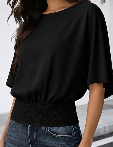 Mulheres Camiseta Camisetas Cintura em Elástico Franzido Côr Sólida à moda Casual Manga Curta Manga Morcego Gola Redonda Decote Redondo Tops regulares Diário Para Noite Preto Branco Verde Caf