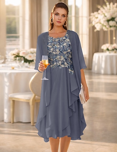 Duas Peças Linha A Até os Joelhos Vestido de convidada de casamento Vestido Para Mãe dos Noivos Sem Manga Manga Longa Scoop pescoço Elegante Simples Luxuoso Formal Convidado do casamento Chiffon com