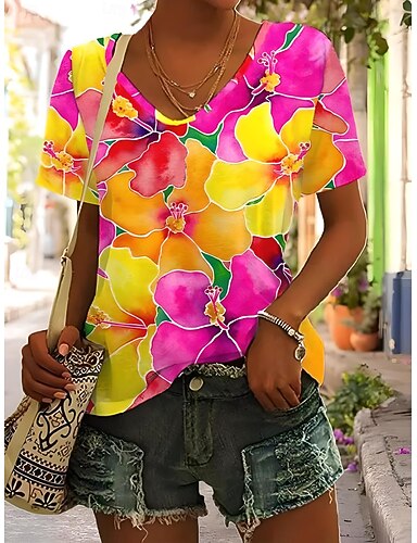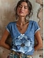 Mulheres Camiseta Imprimir Âmbar Floral Gráfico Vintage à moda Clássico Manga Curta Decote V Tops regulares Diário Azul Amarelo Rosa Roxo Verão Primavera