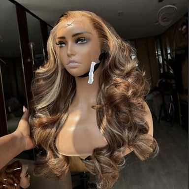 Peruca de cabelo humano com lace frontal colorida e mechas, repartição livre, cabelo brasileiro ondulado loiro castanho multicolorido, sem cola, fecho 5x5 com baby hair/balayage, linha capilar natural