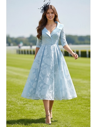 Linha A Longuette Vestido de festa Vestido Coquetel Vestido de convidada de casamento Vestido Para Mãe dos Noivos Manga 3/4 Colarinho de Camisa Elegante Vintage Formal Coquetel Kentucky Derby Cetim
