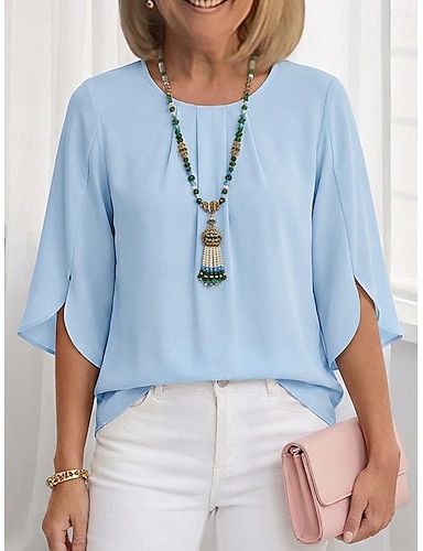 Mulheres Blusa Tops de chiffon Franzido Tecido Ativo à moda Meia Manga Gola Redonda Tops regulares Diário Feriado Para Noite Preto Branco Verde Claro Vinho Azul Marinha Verão Primavera