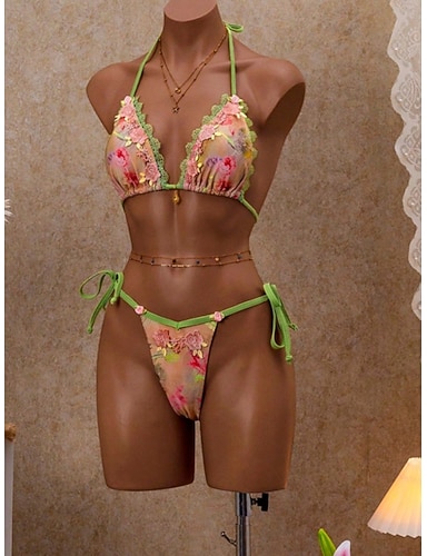 Mulheres Roupa de Banho Biquíni 2 partes Tanga roupa de banho Delgado Frente Única Férias Roupa de Praia Floral Halter pescoço Sem Manga Fatos de banho