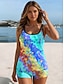 Maiô Tankini Feminino de 2 Peças Palm Boy Leg Costas Nuas Roupas de Praia de Férias Floral U Neck Sem Mangas