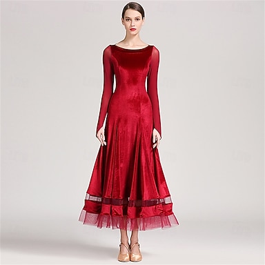 vestido de veludo para dança de salão feminino - vestido de manga comprida em linha A com acabamento em tule para competições, dança latina e eventos de dança - vermelho