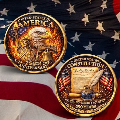 Moeda comemorativa do 250º aniversário dos EUA, celebrando a herança americana com a Estátua da Liberdade e os Pais Fundadores. Uma elegante peça de colecionador.