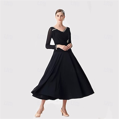 Vestido de dança de salão feminino elegante com decote em V, manga comprida, vestido para competição de valsa e tango com detalhes de strass – preto