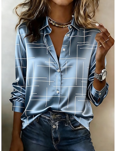 Mulheres Camisa Social Blusa de cetim Imprimir Geométrica Férias Moda Diário Manga Longa Colarinho de Camisa Tops regulares Diário Feriado Para Noite Azul Prata Rosa Verão Primavera Outono