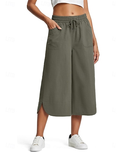 Mulheres Calças Capri Linho de algodão sintético Perna larga chinês Férias Moda Roupa de rua Comprimento da panturrilha Cintura Alta Tecido Cintura elástica Confortável Conforto Macio Com Stretch
