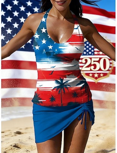 Dia da Independência Aniversário Americano Patriótico Moda Praia Feminina Tankini Saia Elegante Férias Estampa Gráfica Bandeira Alça Decotada Sem Mangas Trajes de Banho