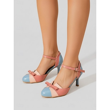 Vestido feminino vintage azul dos anos 1950 &Sapatos Mary Jane rosa com blocos de cor - elegantes sapatos de salto baixo com detalhe de laço, perfeitos para festas de chá retrô e casamentos de verão.