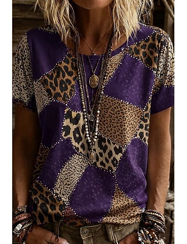 Mulheres Camiseta Imprimir Gráfico Animal Leopardo Vintage à moda Clássico Manga Curta Gola Redonda Decote Redondo Tops regulares Diário Final de semana Verde Claro Rosa Roxo Verão Primavera Outono
