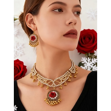 Conjunto de joias femininas de cristal rosa vermelha para festa de Natal, colar gargantilha de ouro vintage e conjunto de brincos de destaque para celebrações de feriados &ocasiões formais