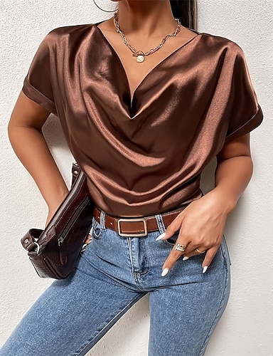 Mulheres Elegant Top de cetim Blusa Tops elegantes Franzido Patchwork Com Pregas Tecido Elegante Vintage senhoras Sem Manga Decote V Tops regulares Diário Trabalho Feriado Marron Verão Primavera