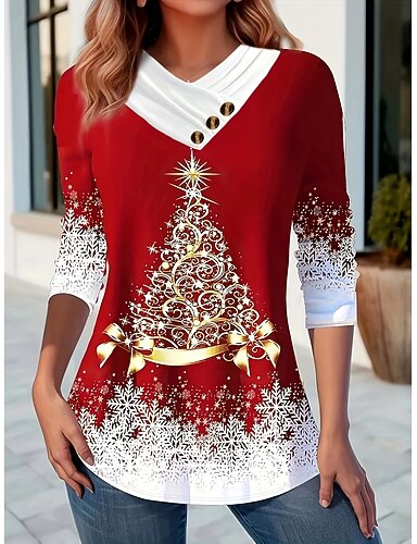 Camiseta Feminina de Natal Gráfica Vintage Estilosa Clássica Manga Longa Decote em V Tops Regulares Botões do Dia Impressão Assimétrica Preta Vermelha Azul Verde Primavera Outono Inverno