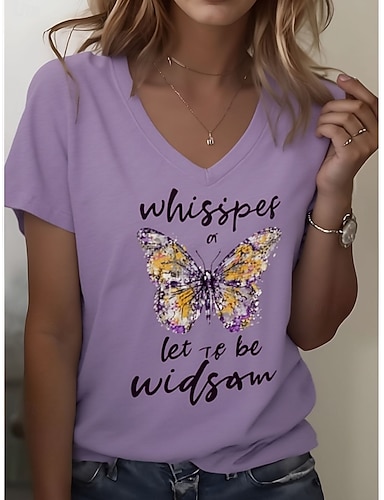Mulheres Camiseta Imprimir Gráfico Libélula Vintage à moda Clássico Manga Curta Decote V Tops regulares Diário Roxo Claro Roxo Arco-íris Verão Primavera